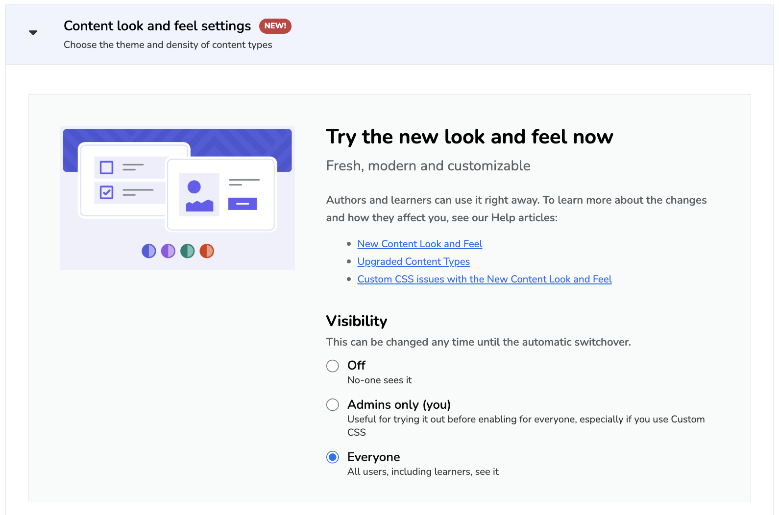 Important: The Visibility settings will only be available for existing organizations and will be set to Off by default. For organizations created after the release, only the new theme will be enabled, being the default theme for everyone.